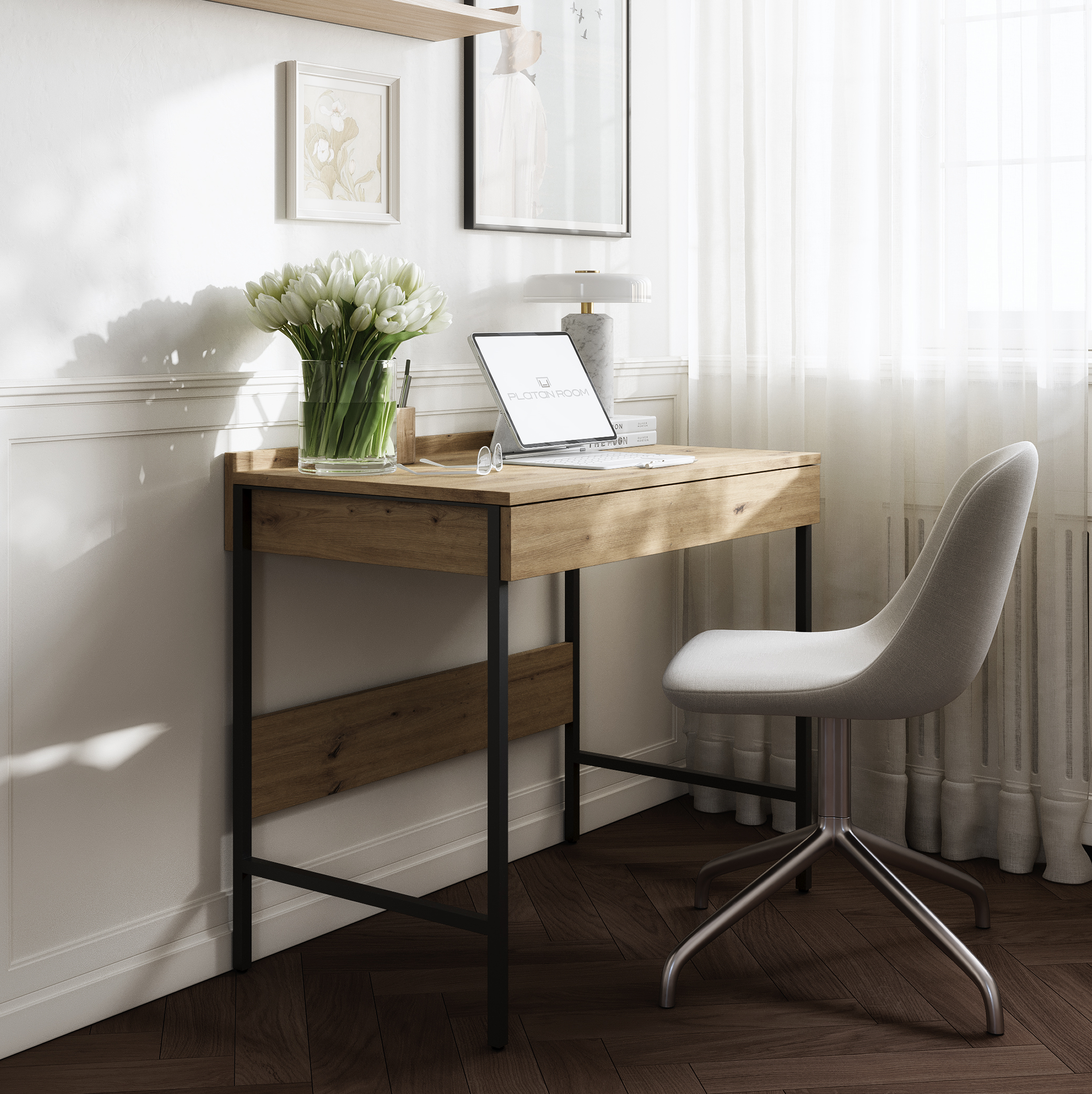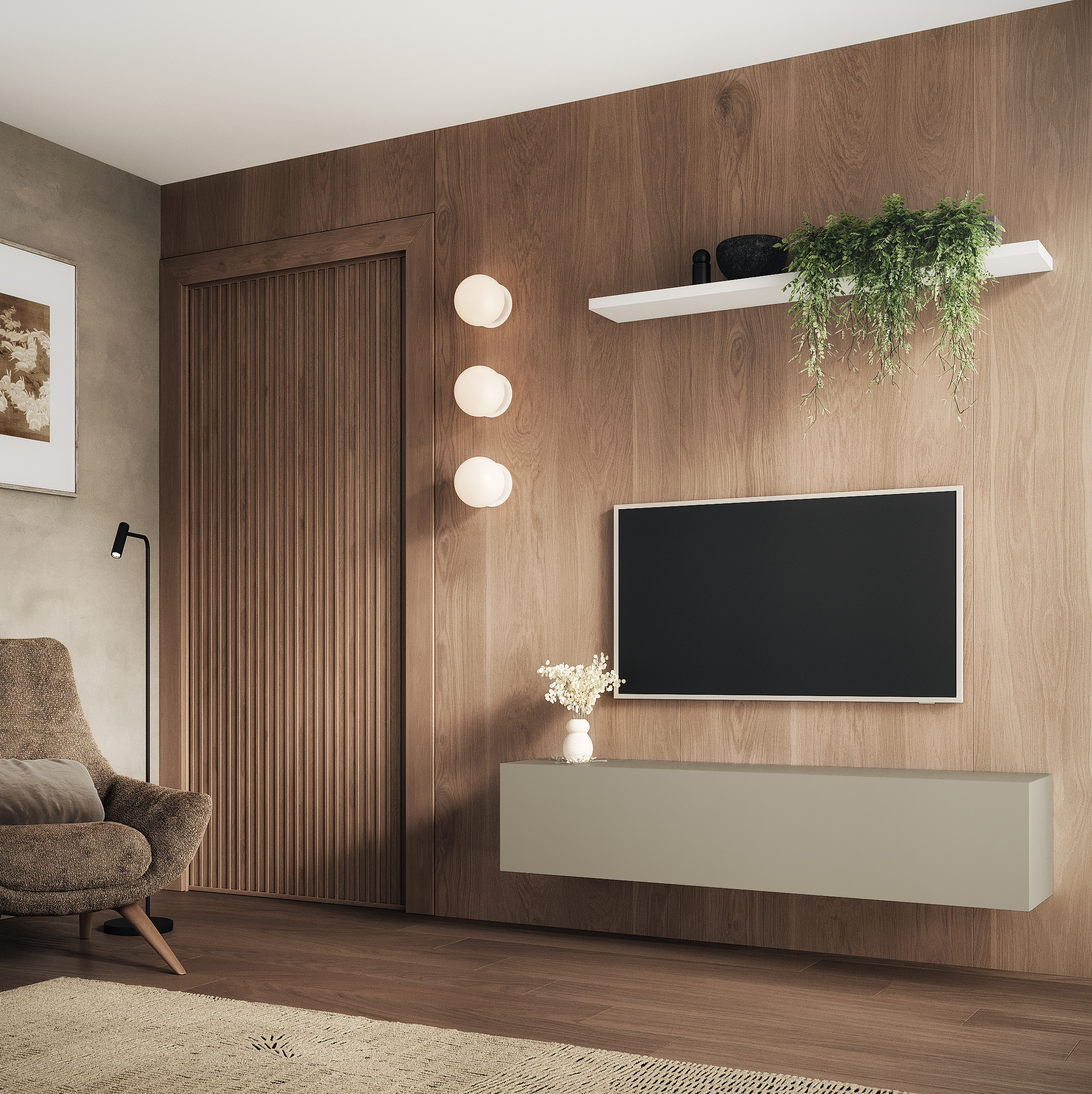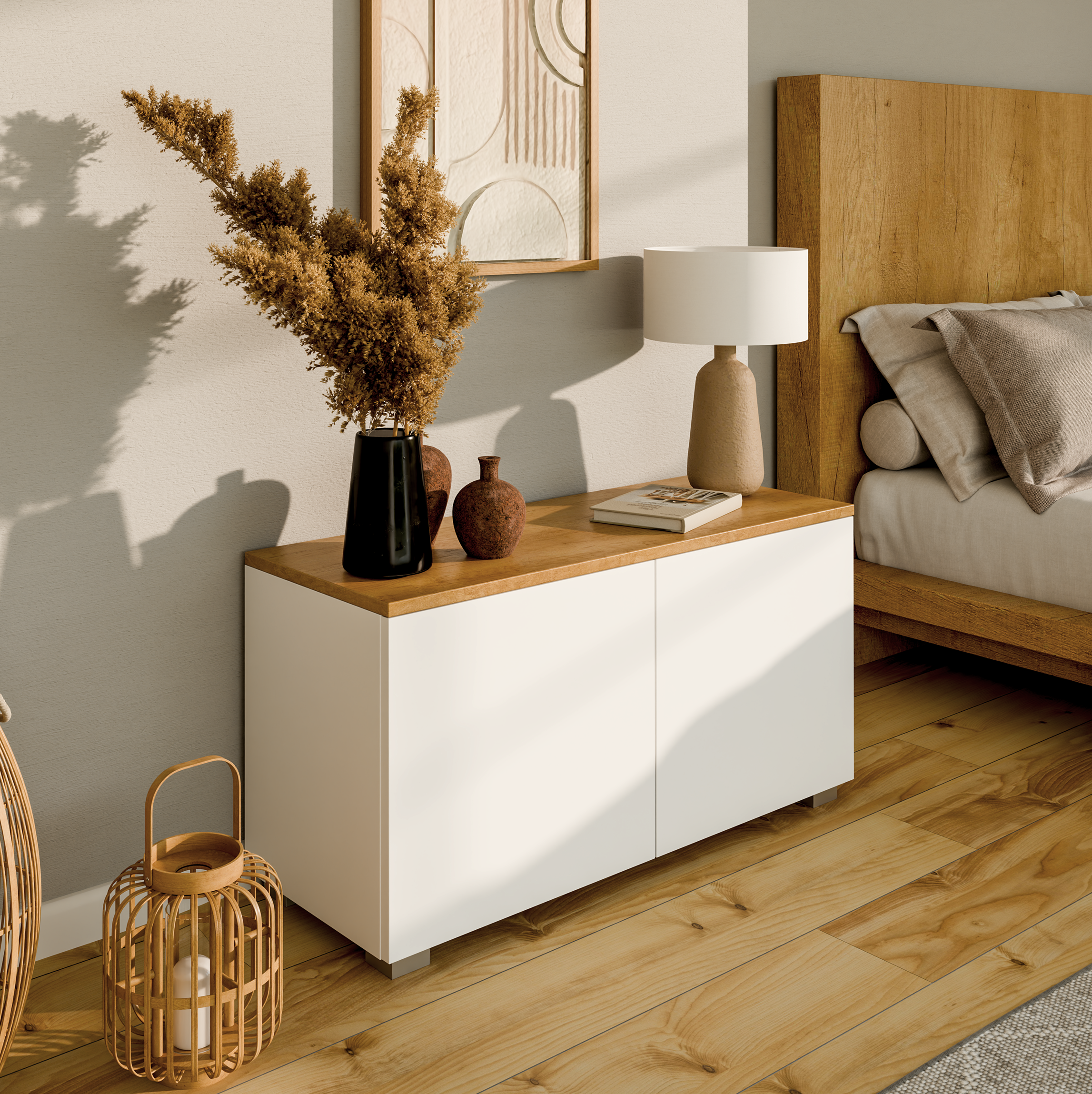 The TV cabinet from the LUNA collection is characterized by a simple and modern design . The top plate of this variant is made in oak color with a matte finish, which gives it a luxurious and unique look. Thanks to the push-to-open function, you can easily open the door without using handles or handles.