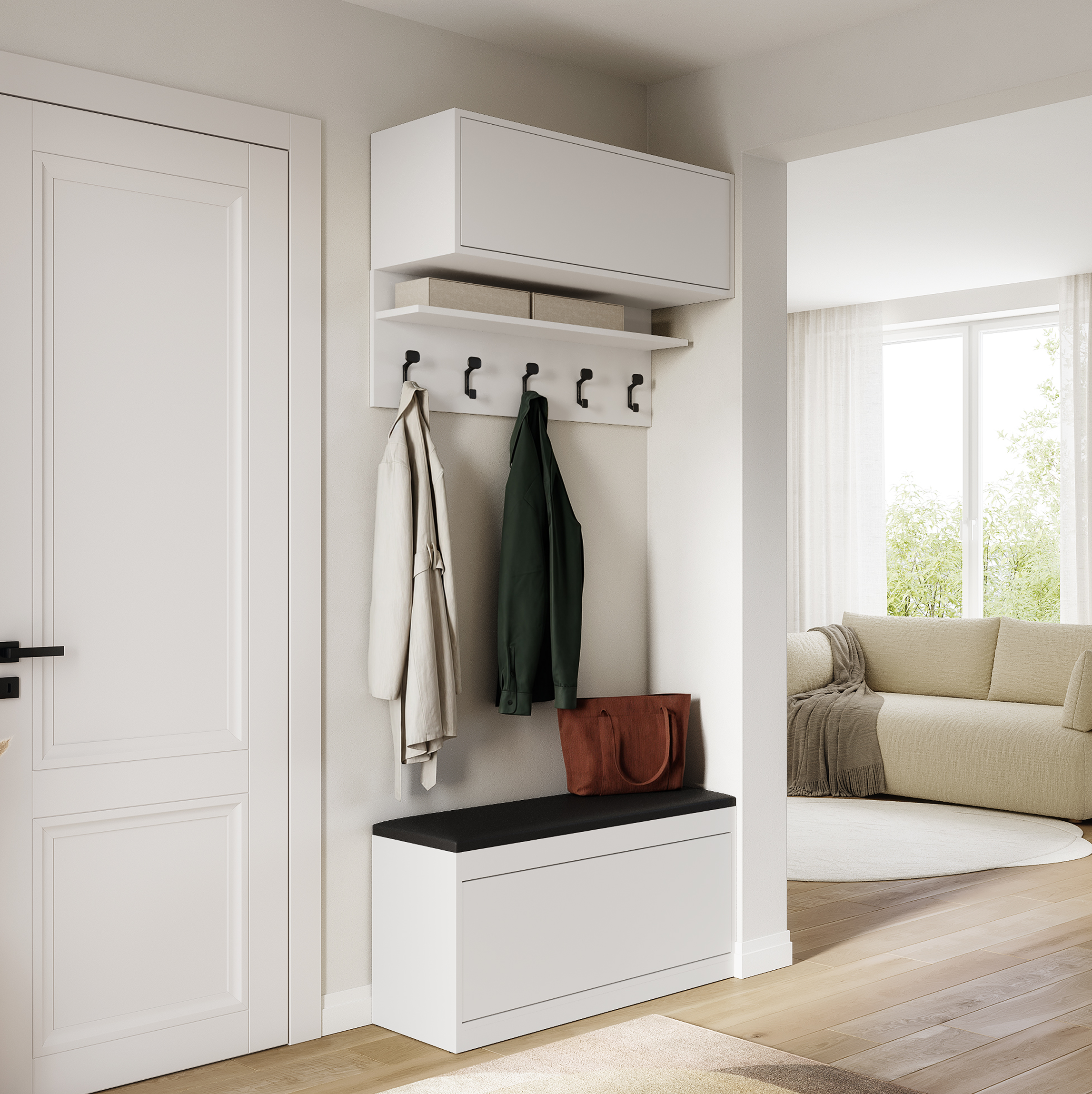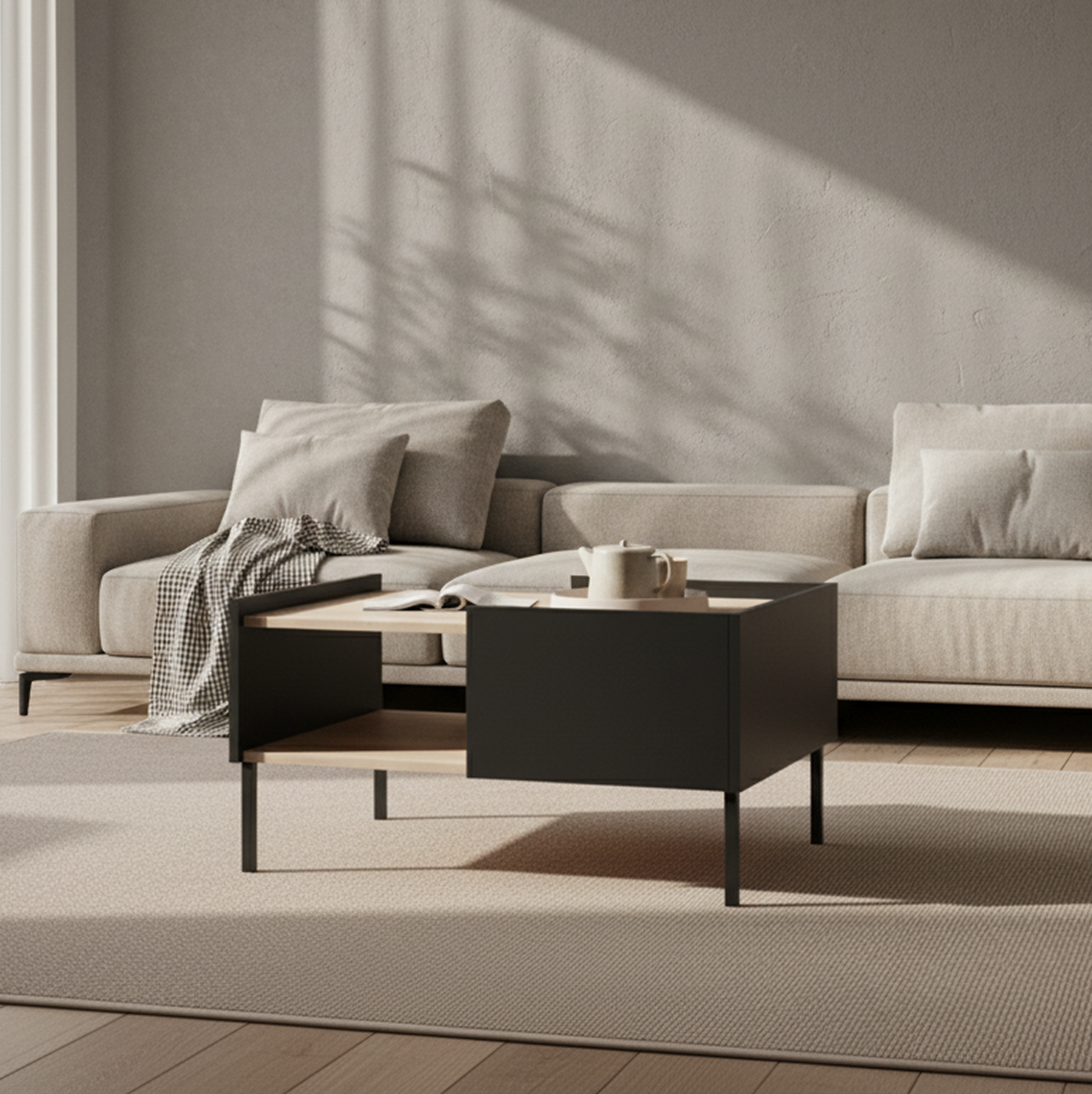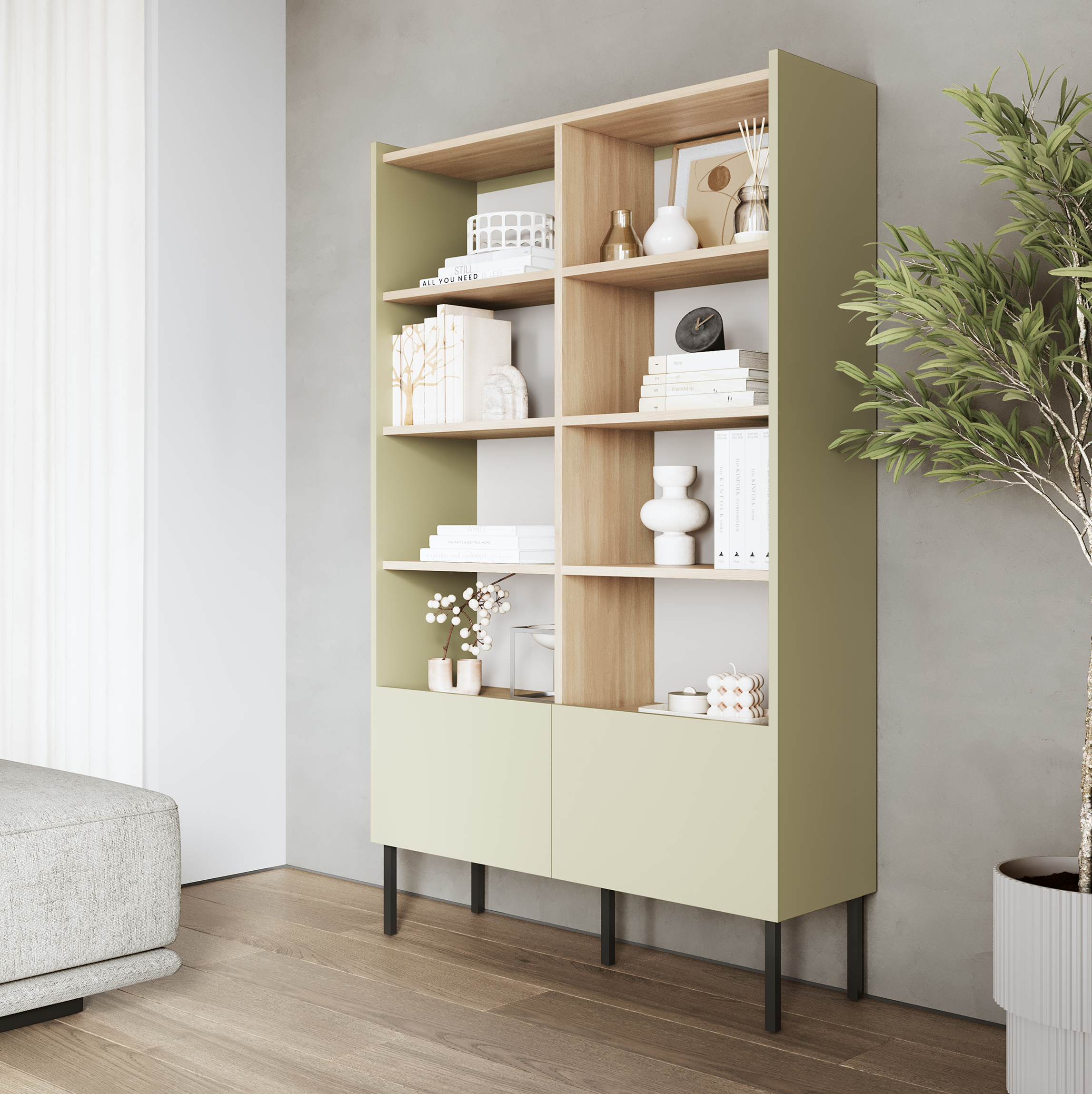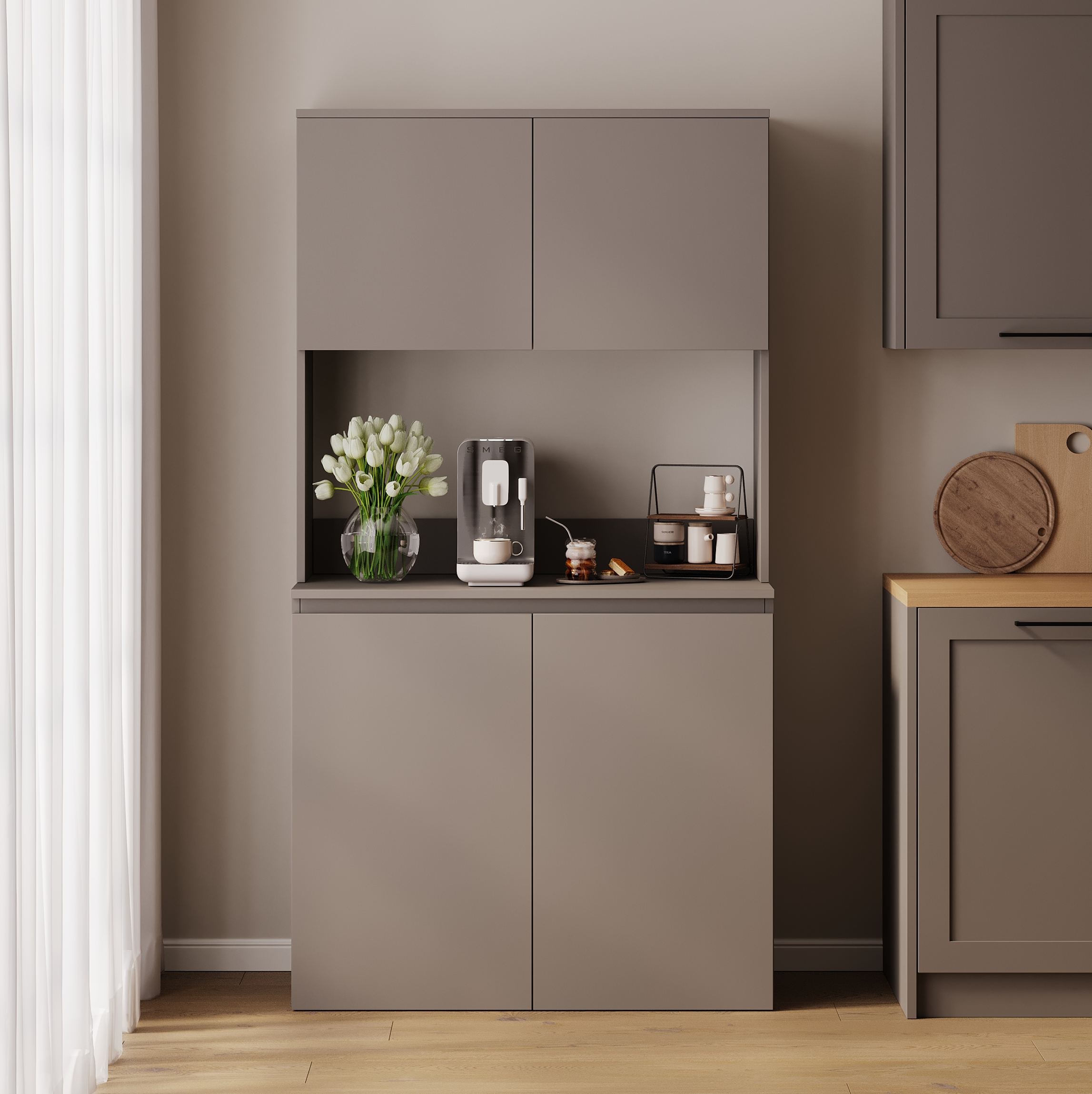 The TV cabinet from the LUNA collection is characterized by a simple and modern design . The top plate of this variant is made in oak color with a matte finish, which gives it a luxurious and unique look. Thanks to the push-to-open function, you can easily open the door without using handles or handles.